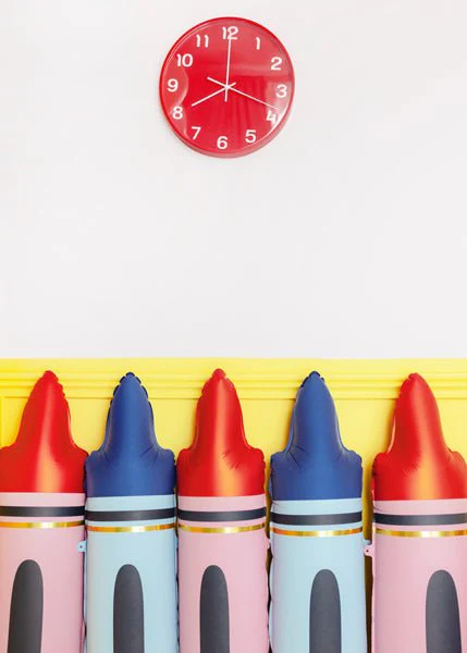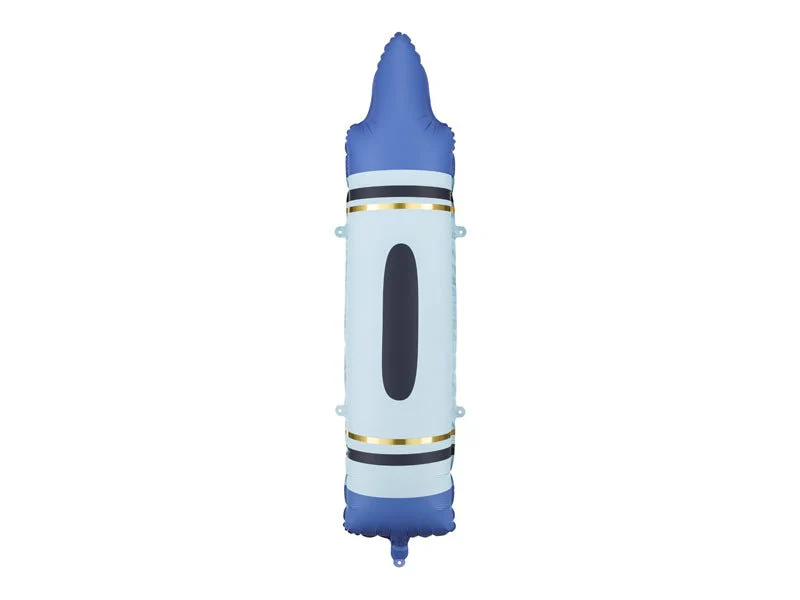 Färgpennor folieballong, blå. Storlek före uppblåsning ca 34,5×108 cm, storlek efter uppblåsning ca 23×104 cm. Kan blåsas upp med luft och helium. Ett sugrör ingår i setet.