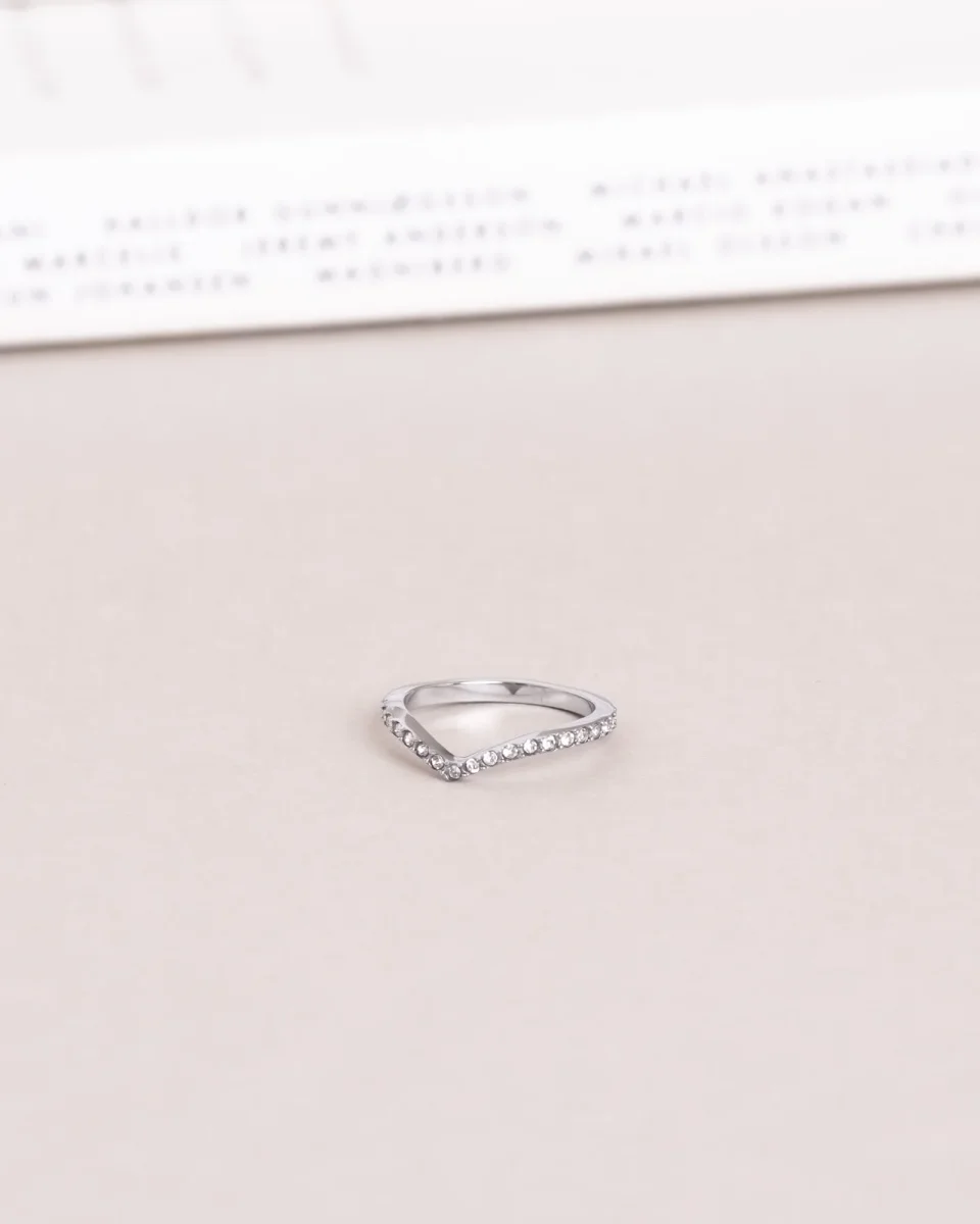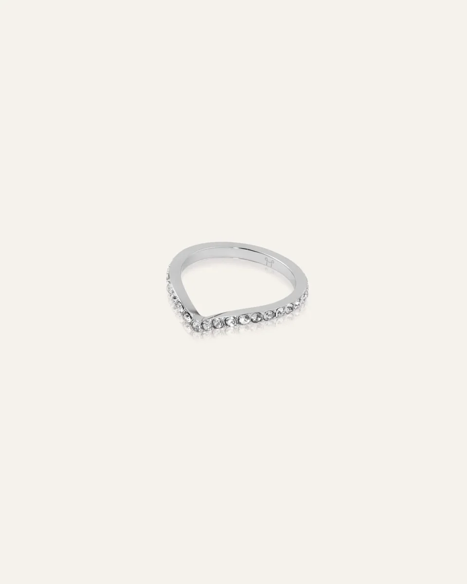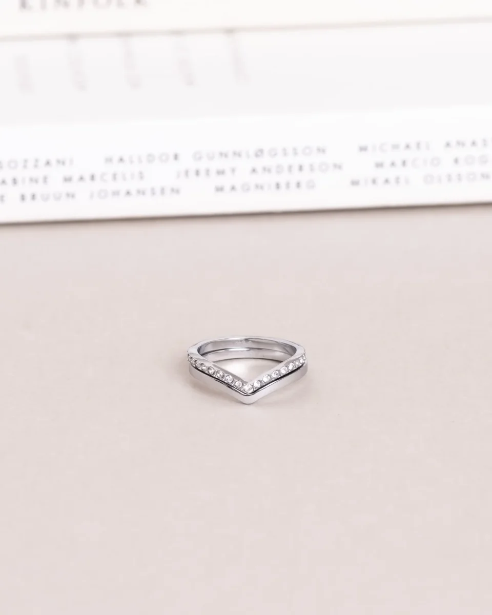Brilliant Ring är en nytolkning av Honest Ring – smal, stilren och V-formad, dekorerad med små gnistrande stenar. Tillverkad i massivt rostfritt stål med en slitstark PVD-plätering, vilket gör den vattentålig och hållbar. Bär den varje dag – bada, duscha och träna utan att oroa dig för att den tappar färg.