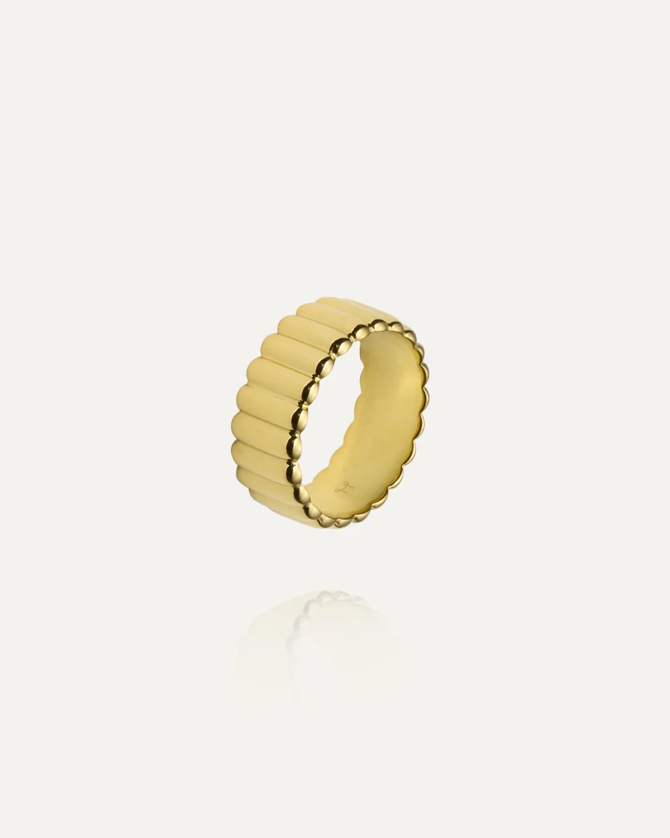 Chic Ribbed Ring har en bred och räfflad design. Tillverkad i massivt rostfritt stål med en slitstark 18K guld PVD-plätering, vilket gör den vattentålig och hållbar. Bär den varje dag – bada, duscha och träna utan att oroa dig för att den tappar färg.