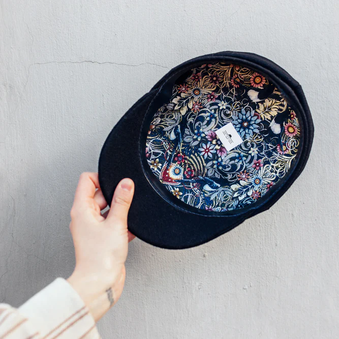 Hatthyllans egendesignade vegamössa är tillverkad av Refat Agid på CTH Ericsons hattfabrik i Borlänge. Yttertyget är ett Melton tyg i 100% ull från väveriet Albano Morgado från Portugal. Vegamössans innerfoder har ett vackert fågelmotiv som är tillverkat av överblivet tyg i 100% Polyester (ett utmärkt miljöval eftersom överblivet tyg inte går till spill).