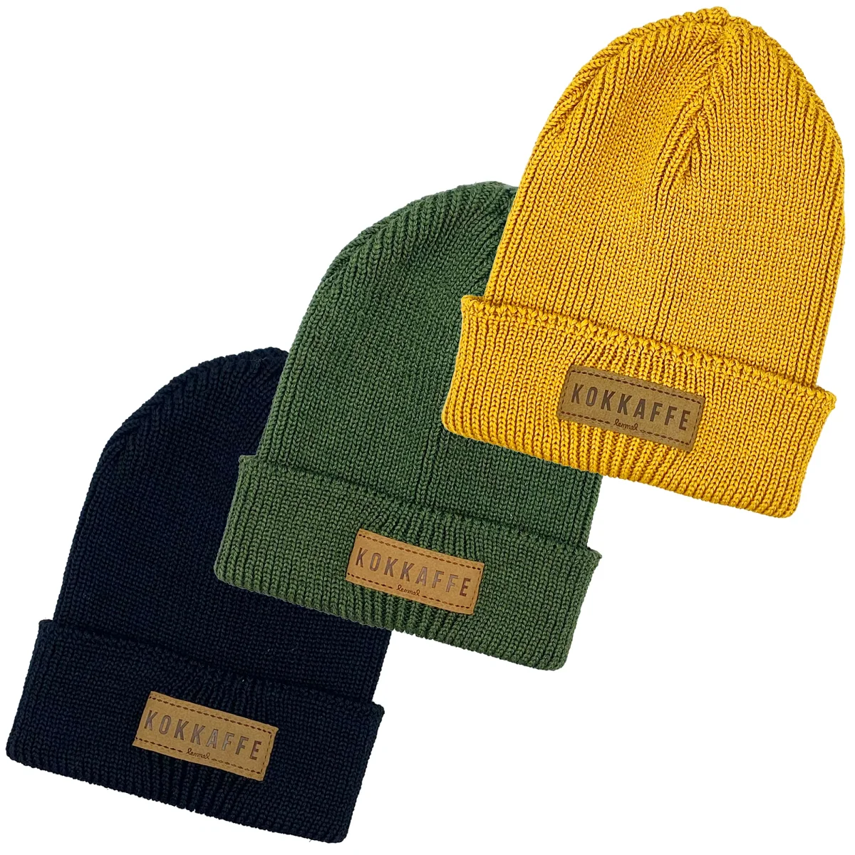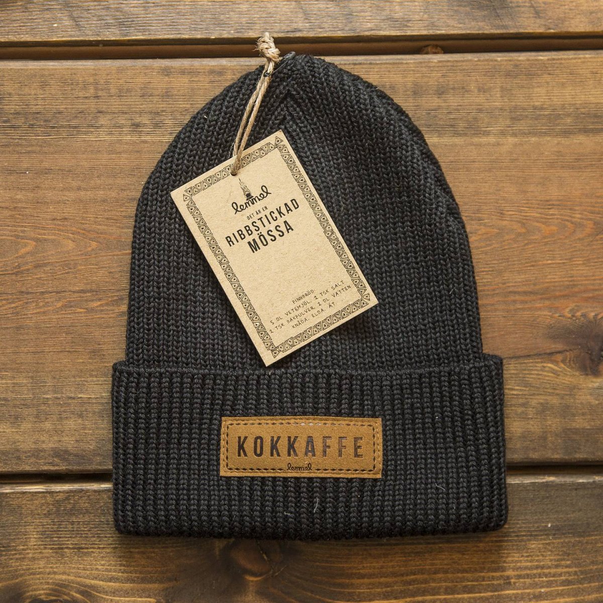 Svart mössa som kallas Glöden från Lemmelkaffe, mössan är ribbstickad med ett lädermärke som det står kokkaffe på. Finns även i andra färger, grön och gul.
