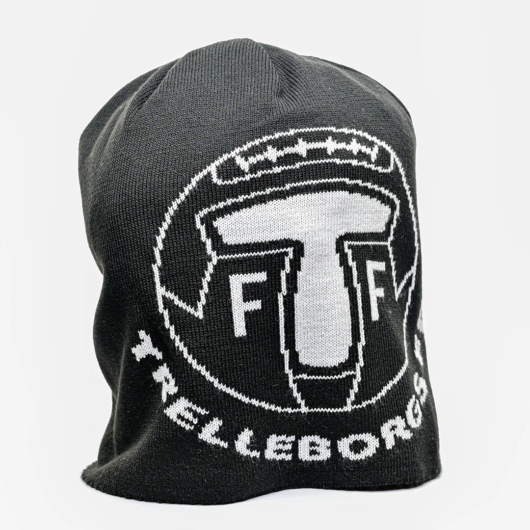 Tunn enkeltstickad mössa med instickat TFF-märke.