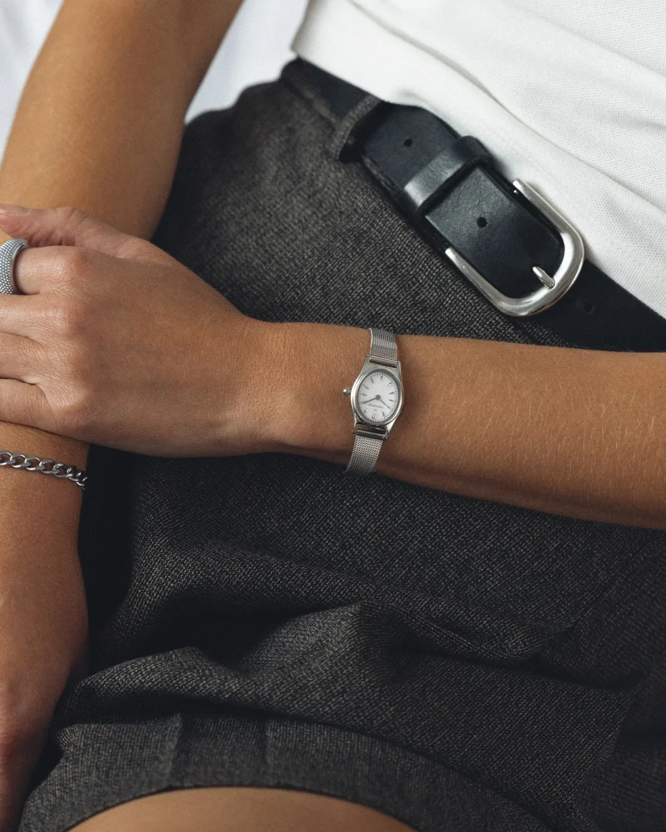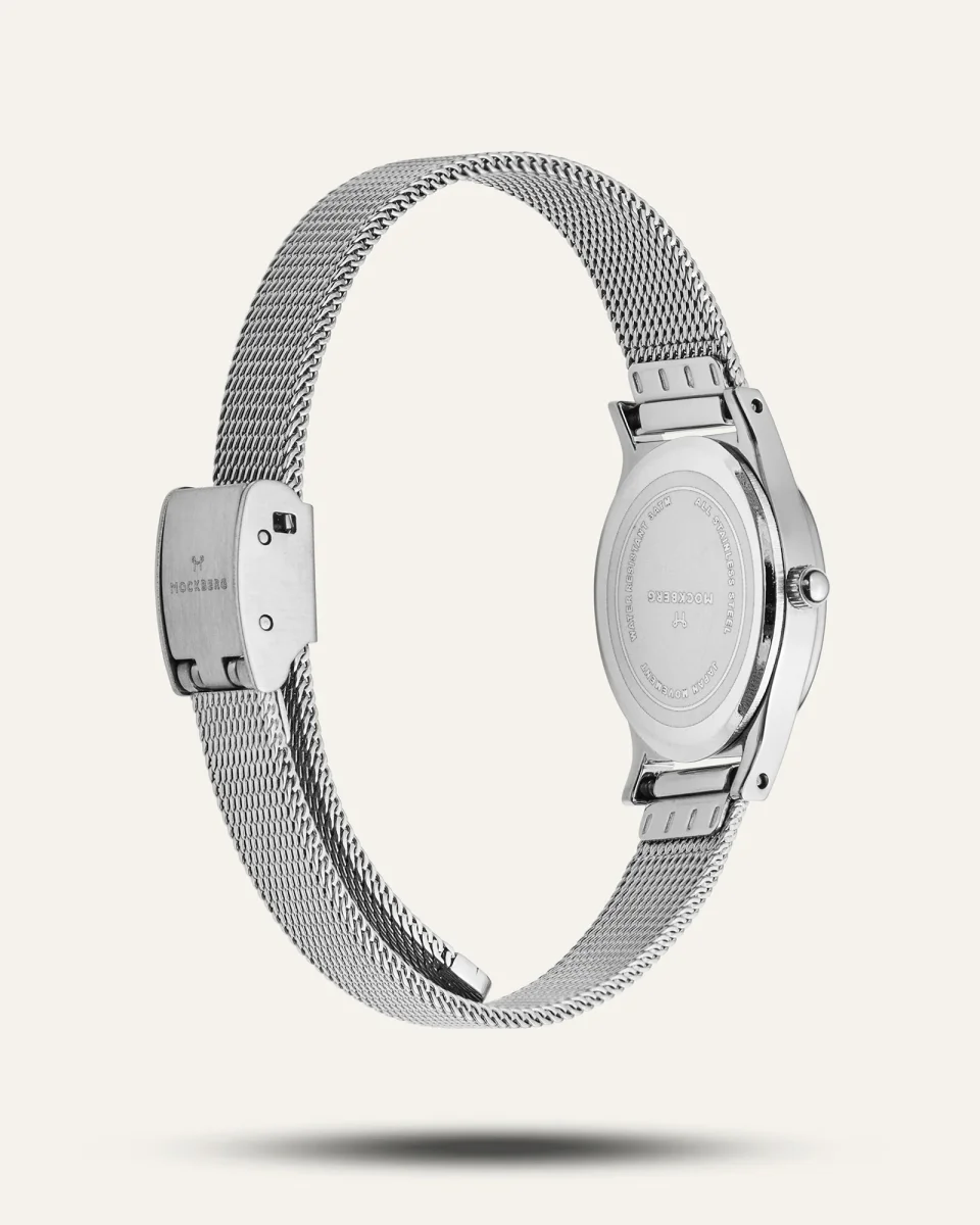 Inspirerad av vintageestetik och modern design. En klocka i nätt modell med ett elegant mesharmband som ger en tidlös och stilren känsla.