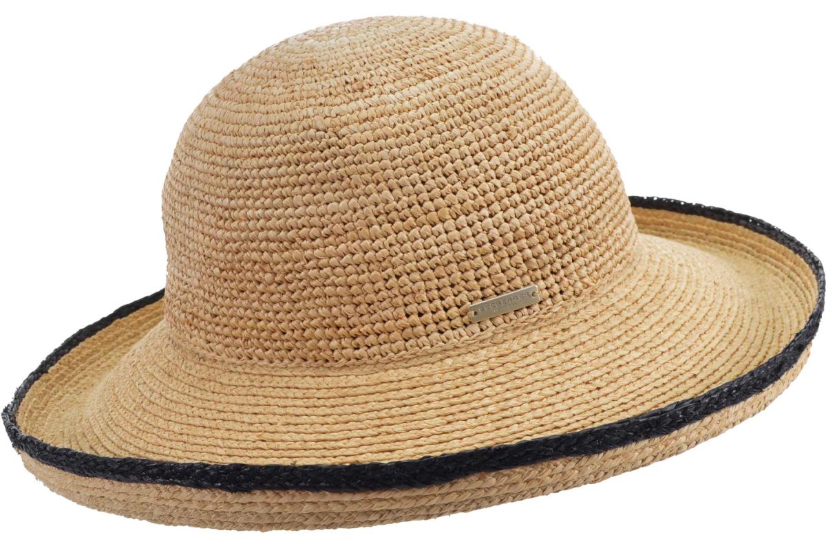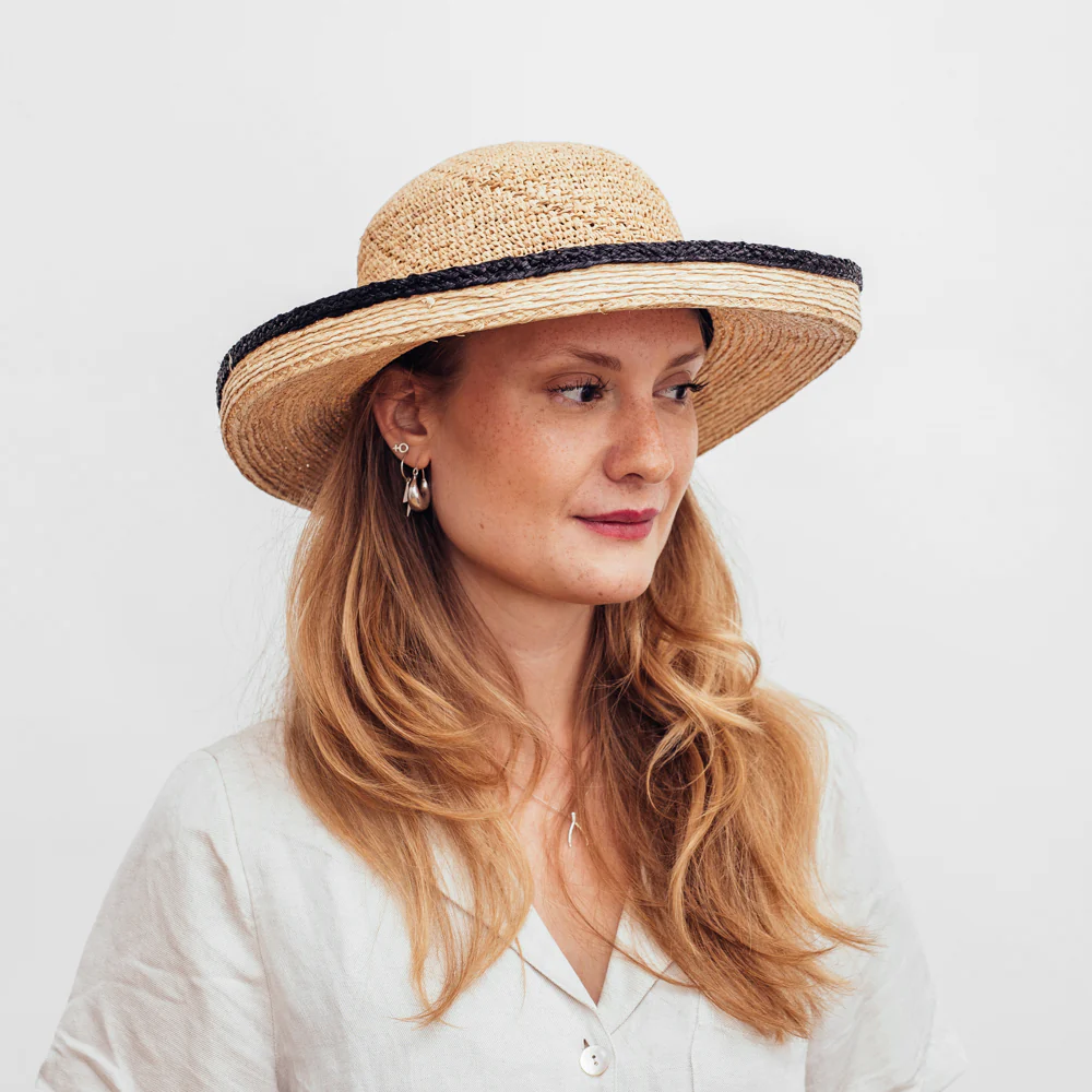 Hatten är naturfärgad med en svart kant och är one size