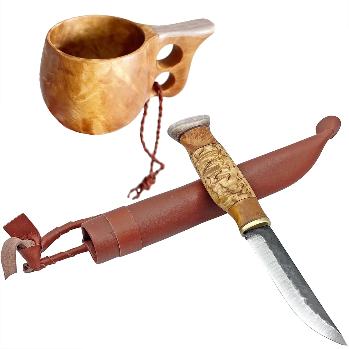 Exklusivt set för den friluftsintresserade! Setet innehåller en tvåhålskåsa av björkvril med renohorn som är perfekt att gravera ett namn på. Samt en mellanstor kniv med 9,5 cm långt knivblad i hamrat kolstål. Handtaget är tillverkat av masurbjörk, vril av vide och renhorn.