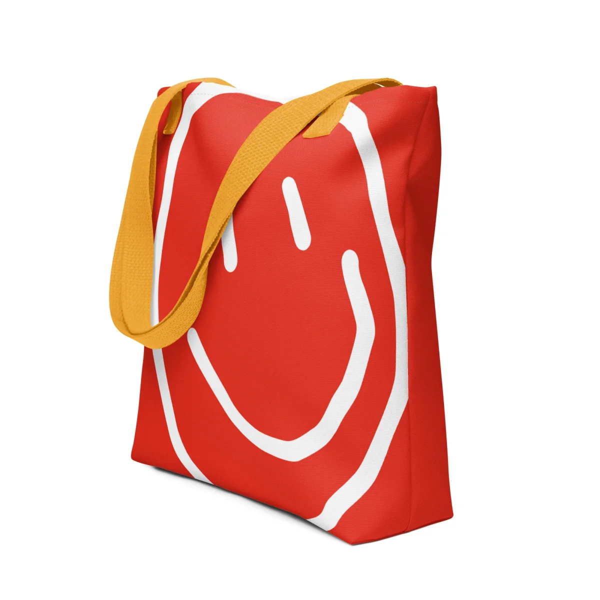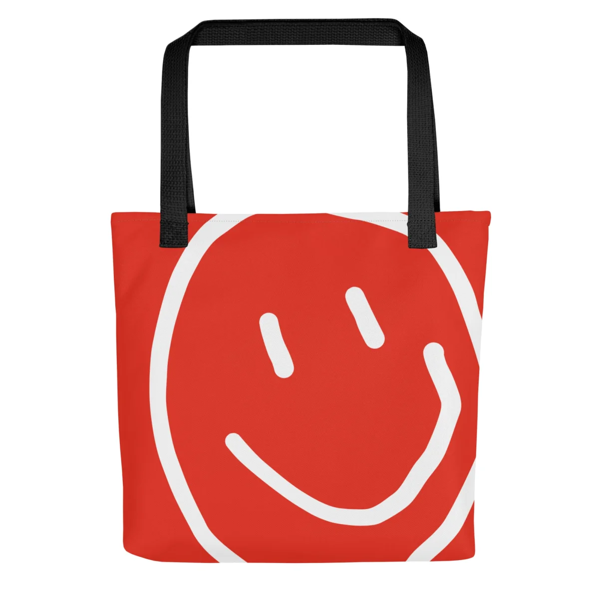 En rymlig mönstrad tygväska med axelrem. Finns två färger på axelremmarna att välja mellan. Ett ritat leende blir ett skämtsamt tryck i denna kollektion.