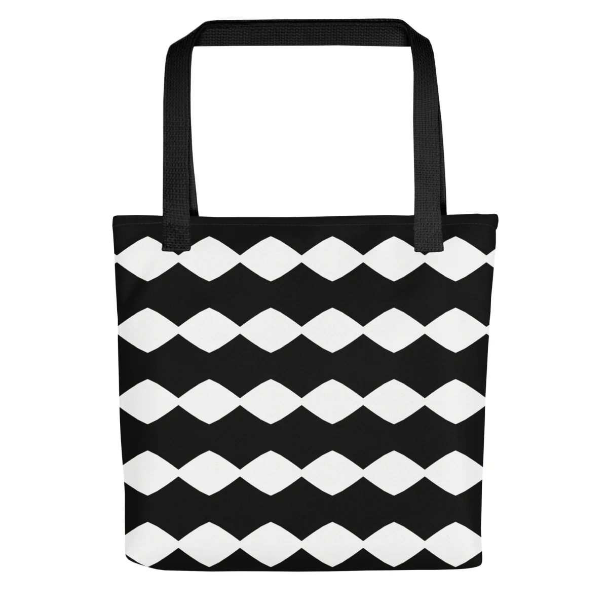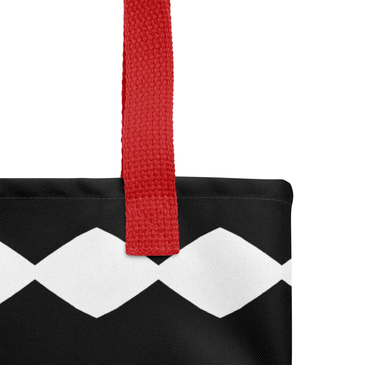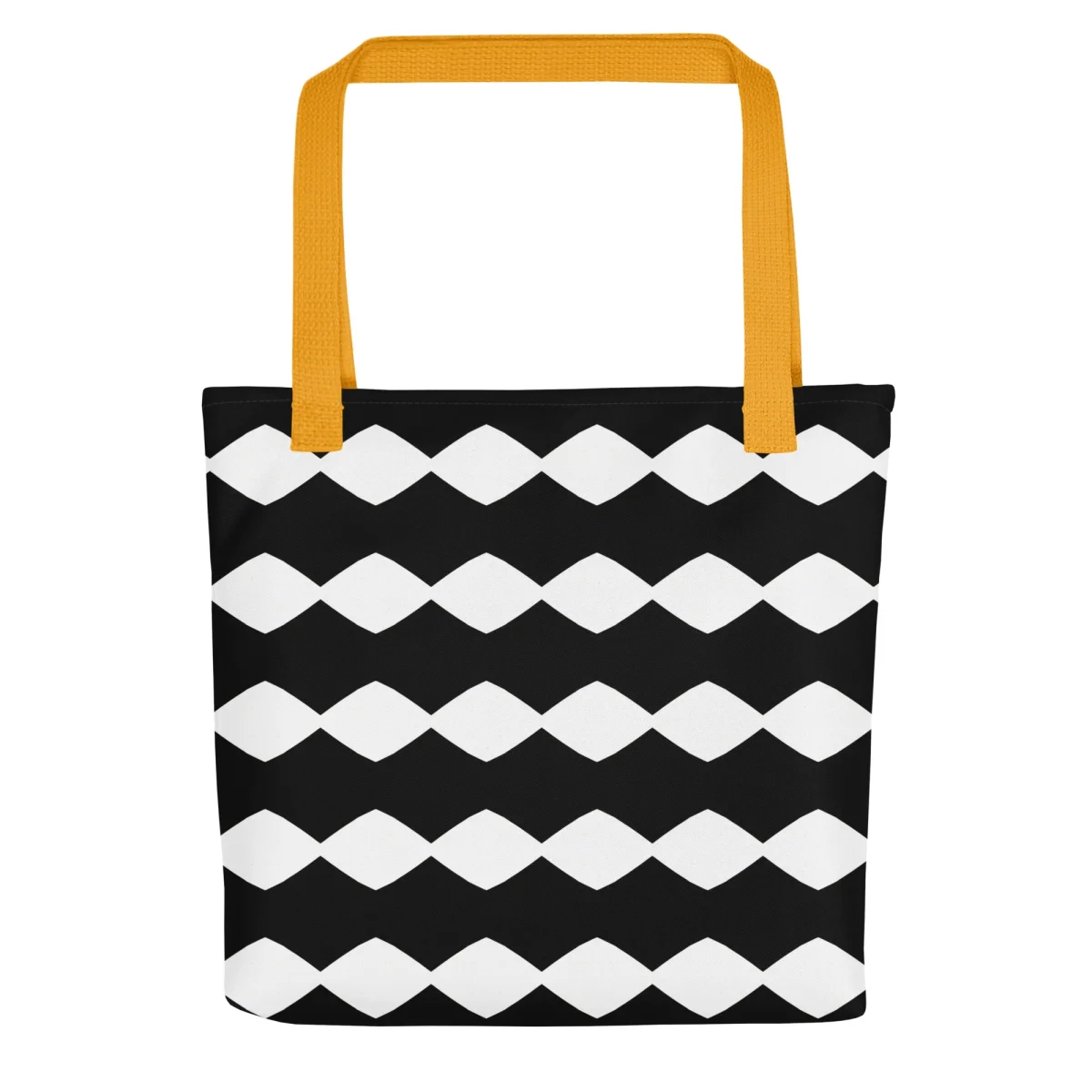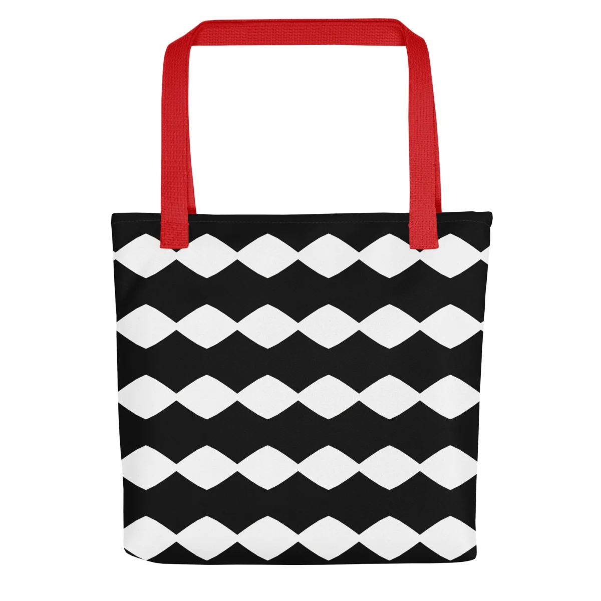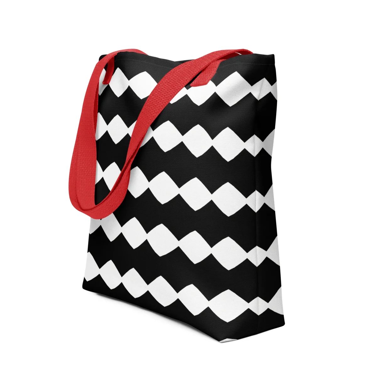 En rymlig mönstrad tygväska med axelrem. Finns tre färger på axelremmarna att välja mellan. I denna kollektion möts penseldrag och pixlar i mönstren.