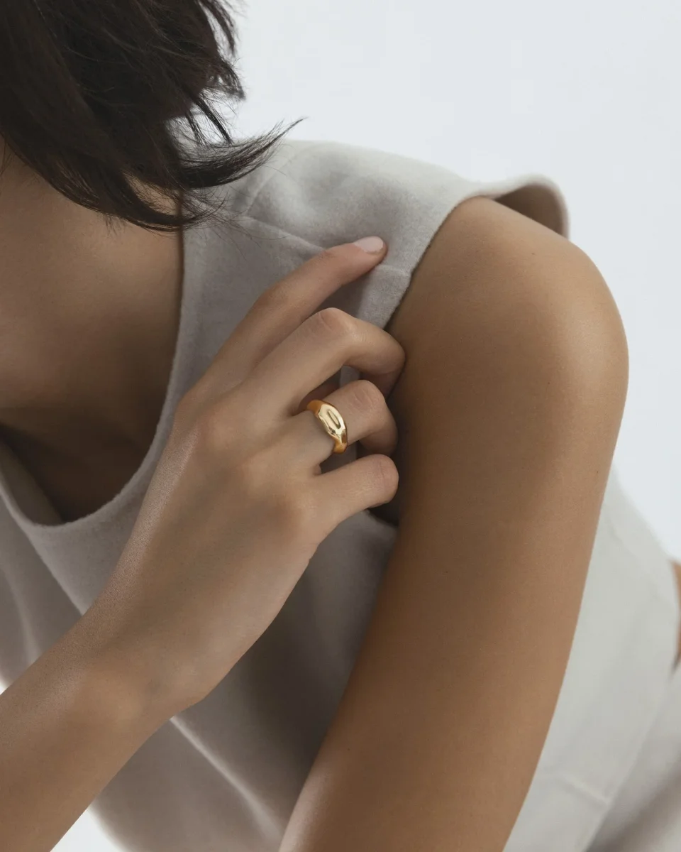 Wavy Bolded Ring är en bredare ring med en mjukt vågig design från Wavy-kollektionen. Tillverkad i massivt rostfritt stål med en slitstark 18K guld PVD-plätering, vilket gör den vattentålig och hållbar. Bär den varje dag – bada, duscha och träna utan att oroa dig för att den tappar färg.