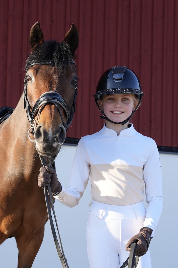 Vit och beige långärmad ridtopp för barn designad för en elegant och stilren look. Passar perfekt som tävlingstopp.